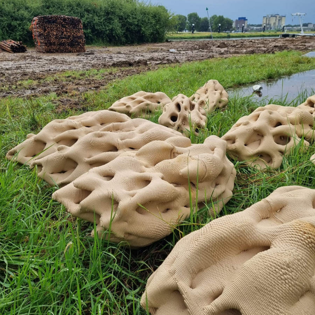 ‘Het Rotterdamse Bedrijf Urban Reef ontwikkelde deze 3D, van klei geprinte en afgebakken keramieken ‘getijden riffen’. Deze bestaan, meer dan stortstenen, uit een complex netwerk van holtes en zijn voorzien van een ruw oppervlak.’