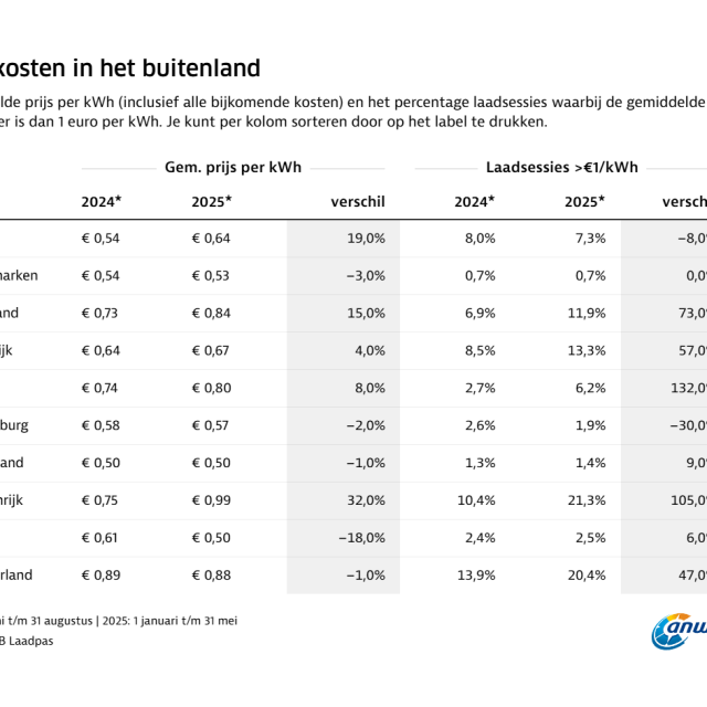 Uit data van ANWB Laadpas blijkt namelijk dat dure laadsessies in het buitenland steeds vaker voorkomen. In Oostenrijk betaalden elektrische rijders in ruim 21 procent van de laadsessies gemiddeld (dus inclusief alle bijkomende kosten) meer dan een euro per kilowattuur. In de zomer van 2024 was dat nog in iets meer dan 10 procent van de gevallen. Ook in Frankrijk, Italië, Duitsland en Zwitserland zien we een sterke stijging in het aantal dure laadsessies. Opvallend is dat we in Luxemburg en België juist een daling zien.