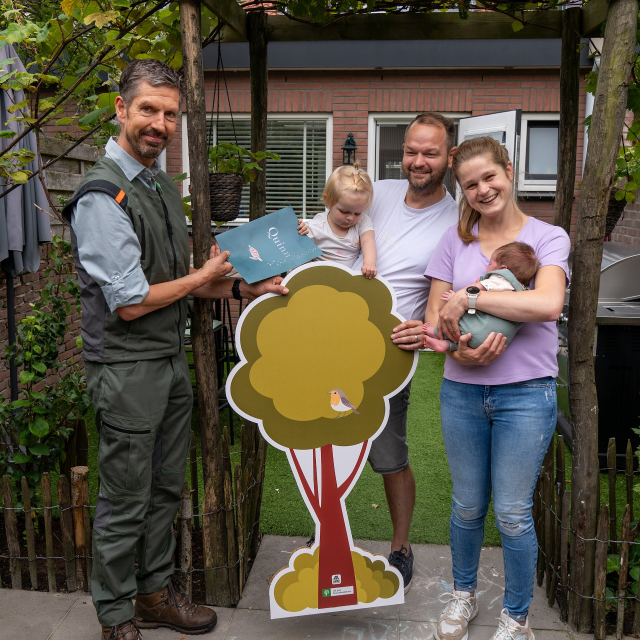 Staatsbosbeheer boswachter Rein Zwaan overhandigt symbolisch de eerste van 125 Geboortebomen aan de ouders van baby Quinn. Zij zijn daarmee de eerste winnaars van de Staatsbosbeheer geboortekaartjes-actie. In het komende plantseizoen, dat start in november, worden alle winnaars uitgenodigd om de Geboorteboom zelf te komen planten in een van de vijf Geboortebossen.