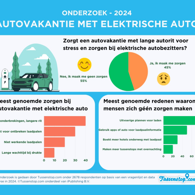 Uit recent onderzoek door boekingssite tussenstop.com blijft dat 45% van de Nederlandse bezitters van elektrische auto's tegen de lange autorit opziet vanwege de vele laadmomenten en de mogelijke stress rondom het vinden van laadpalen. Binnen deze groep maakt 40% zich zorgen over het veelvuldig moeten opladen, 30% over de mogelijke stress van het ontbreken van laadpalen, 20% over niet-werkende laadpalen en 10% over de lange wachttijd bij drukte bij laadpalen.