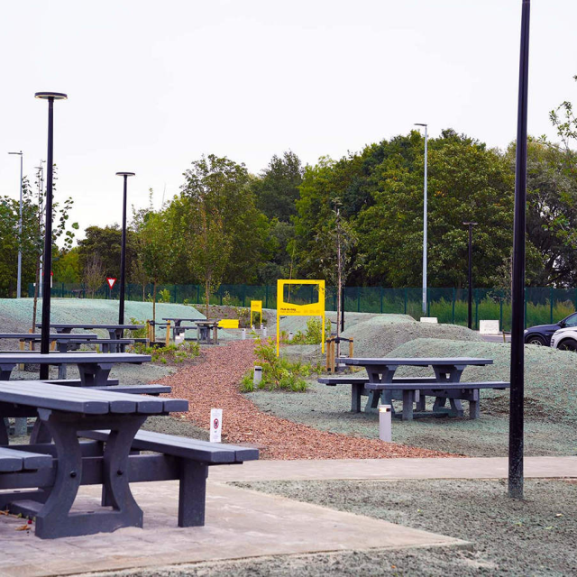 Het hele terrein—voorheen een kale parkeerplaats—is opnieuw aangelegd om beschutting te bieden van de snelweg, met veel groen en nieuwgeplante bomen en bloemen die een prettige plek creëren om uit te rusten tijdens een lange reis.