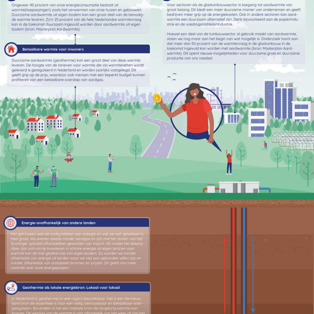 Er zijn veel meer putten op veel meer plaatsen nodig om de ambities uit het Klimaatakkoord te realiseren. Het gat tussen wat we nodig hebben aan energie en wat we zelf opwekken is heel groot. We winnen steeds minder aardgas en zijn met het sluiten van het Groninger gasveld afhankelijker geworden van import. We moeten daarom meer investeren in schone energie uit eigen land en voor warmte kan dit met geothermie van eigen bodem. Zo worden we minder afhankelijk van energie uit landen waar we niet aan gebonden willen zijn en minder afhankelijk van onstabiele bronnen en prijzen. Dit geeft ons meer controle over onze energieprijzen. Lees hoe geothermie kan bijdragen aan de lokale economie en aan onze energie-onafhankelijkheid in de infographic Geothermie Goed Geregeld - Warmte uit eigen bodem (zie download).