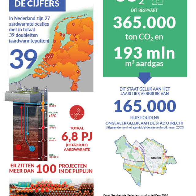 Het aandeel aardwarmte in Nederland leverde omgerekend 365.000 ton minder aan CO2-uitstoot op. Met 39 aardwarmtedoubletten op 27 locaties levert aardwarmte een besparing op van meer dan 193 miljoen m3 aardgas per jaar. Dit staat gelijk aan de hoeveelheid aardgas die huishoudens in een stad met de omvang van Utrecht in 2023 verbruikten.