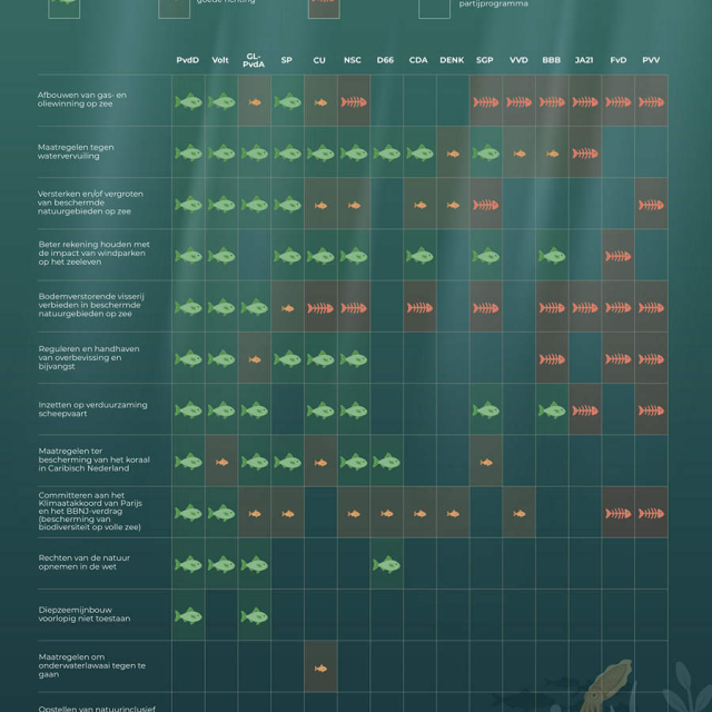 In veel partijprogramma’s krijgt de zee vooral aandacht als plek om de energietransitie te verwezenlijken. Niet als ecosysteem dat bescherming verdient. Wel willen vrijwel alle partijen maatregelen nemen tegen watervervuiling, behalve JA21. Een ander opvallend onderwerp is bodem verstorende sleepnetvisserij. Wetenschappers pleiten voor een verbod op zulke visserij in beschermde natuurgebieden, maar alleen Partij voor de Dieren (PvdD), Volt en GL/PvdA hebben daarvoor concrete plannen. Onder meer de BBB, PVV en CDA willen juist wel met bodemsleepnetten blijven vissen in beschermde natuurgebieden. Diepzeemijnbouw komt in de programma’s nauwelijks aan bod. Alleen PvdD en GL/PvdA zeggen dat ze diepzeemijnbouw niet willen toestaan. Ook onderwaterlawaai krijgt nagenoeg geen aandacht, terwijl het grote gevolgen heeft voor het onderwaterleven: dieren raken de weg kwijt of kunnen hun prooi niet vinden. De ChristenUnie doet hier als enige een stap in de goede richting volgens de ZeeWijzer.
