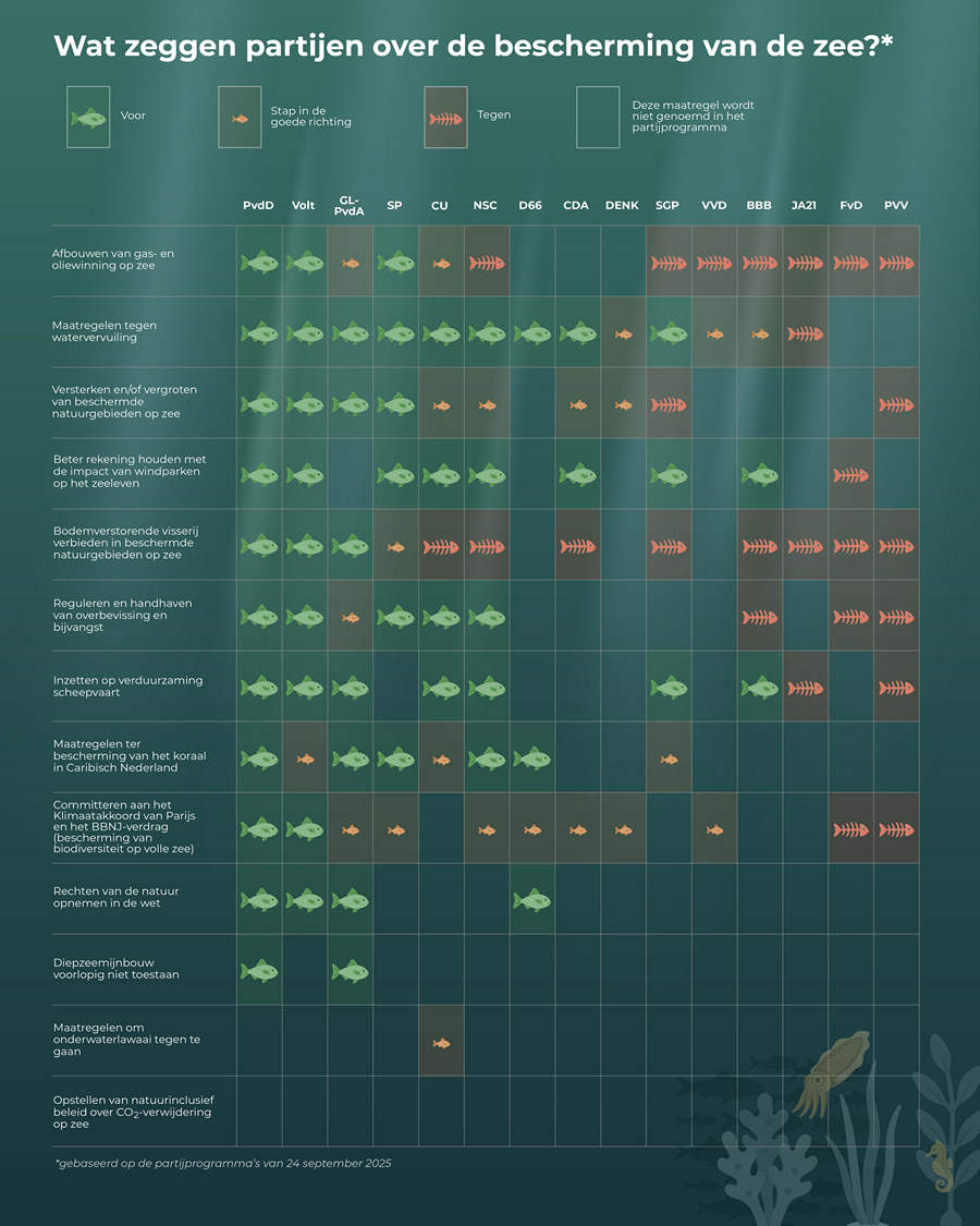 Wetenschappers zeggen al decennia dat zeeën en de oceaan beter beschermd moeten worden, omdat zij cruciaal zijn voor al het leven op aarde. Ze beslaan ruim 70% van de aarde, slaan een kwart van de wereldwijde CO₂-uitstoot op, reguleren het klimaat, leveren voedsel en schone energie, zijn het thuis van duizenden soorten en vormen een cruciale schakel in de Europese natuur- en voedselketens. Het lijkt vanzelfsprekend om zuinig te zijn op onze zeeën en de oceaan. Toch laten politieke partijen dat lang niet allemaal blijken.