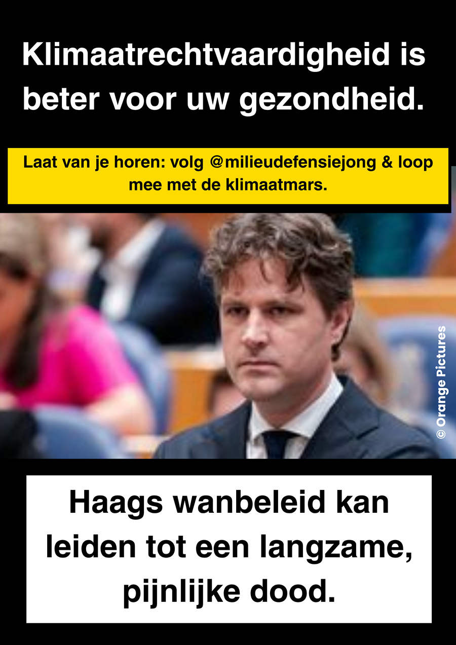 “Haags wanbeleid kan leiden tot een langzame, pijnlijke dood”, “Klimaatontkenners zijn schadelijk voor uw vrienden en familie”, en “Een coalitie zonder klimaatvisie kan uw ongeboren kind doden”. Deze leuzen staan op duizenden 'verkiezingsposters' die de jongeren van Milieudefensie in de nacht van donderdag 23 oktober op vrijdag 24 oktober in 12 steden door het hele land plakken. De posters in de stijl van de waarschuwingen op sigarettenpakjes bevatten de gezichten van Geert Wilders, Dilan Yesilgöz, Caroline van der Plas en Henri Bontenbal. Met de actie vragen de jongeren om meer aandacht voor de klimaatcrisis.